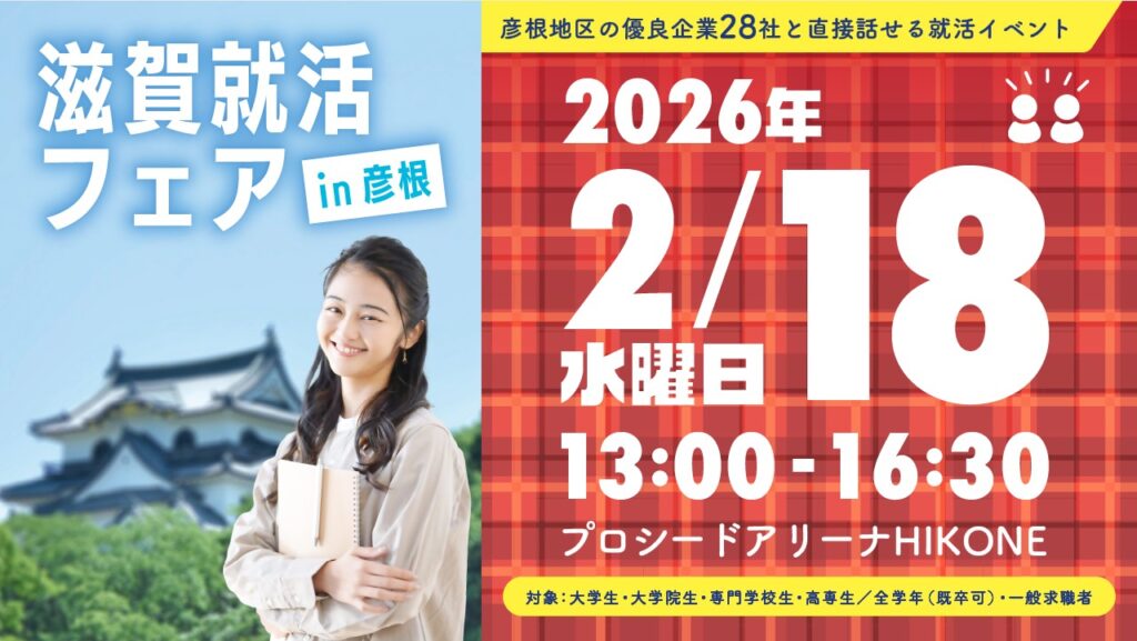 「やっぱり地元で働きたい!」ノースーツで参加しよう!滋賀就活フェアin彦根 彦根地区の優良企業28社と直接話せる就活イベント!「地元・彦根地区で就職もアリだけど、… -
